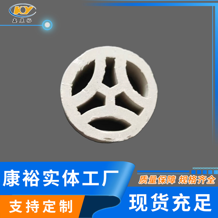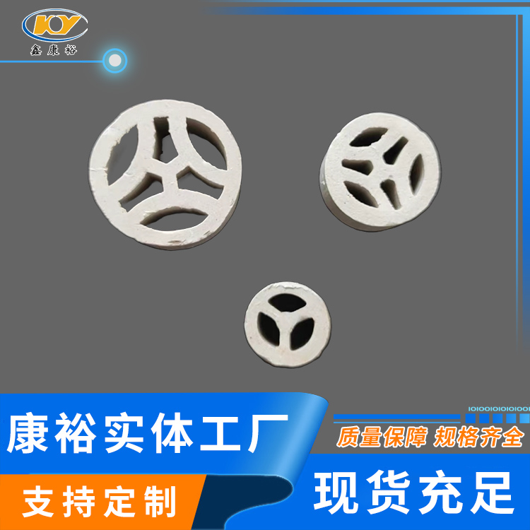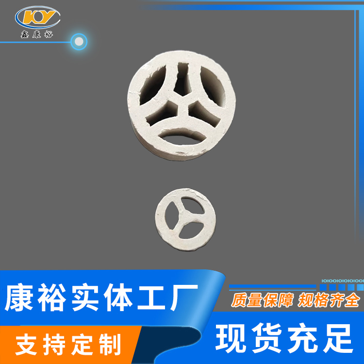 陶瓷三丫環(huán)因其優(yōu)異的工藝加工條件,如原料優(yōu)選,真空擠壓成型以及嚴格控制燒結(jié)工藝中的火焰氣氛,使得陶瓷三丫環(huán)具有瓷質(zhì)致密,色澤均勻,機械強度高,耐壓力沖擊,抗熱震性能好,耐搬運不破損的優(yōu)點。同時陶瓷三丫環(huán)結(jié)構空間性能好,床層使用通氣量大、比表面大、氣液分布均勻、阻力小、壓降低、強度高、氣液傳質(zhì)性能比一般填料好。
